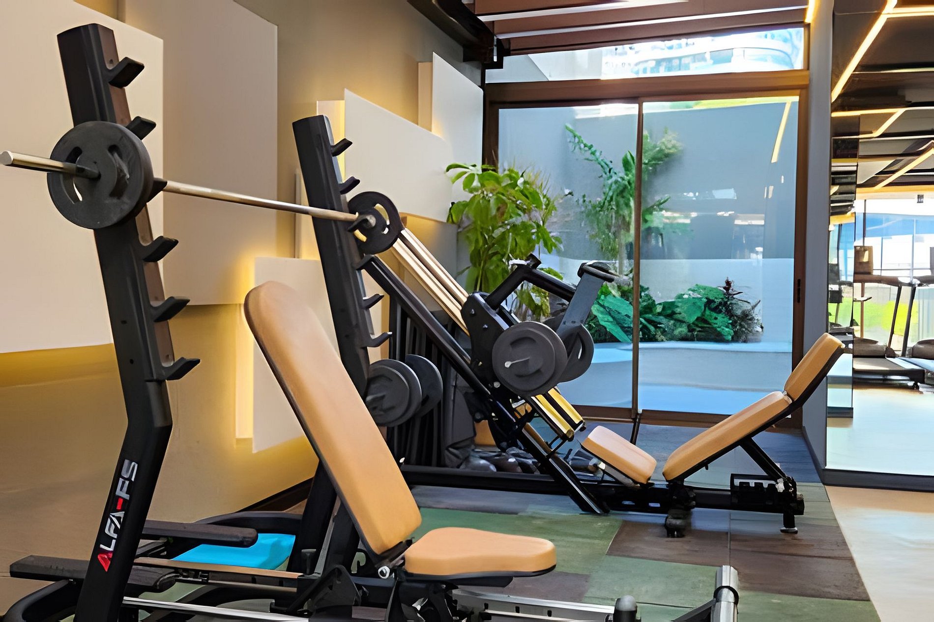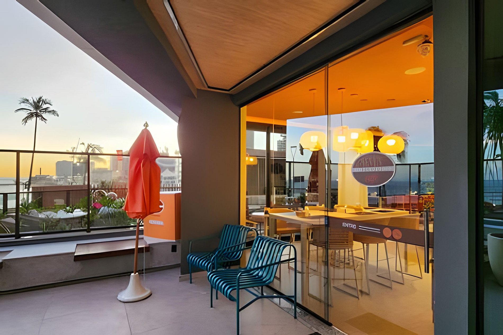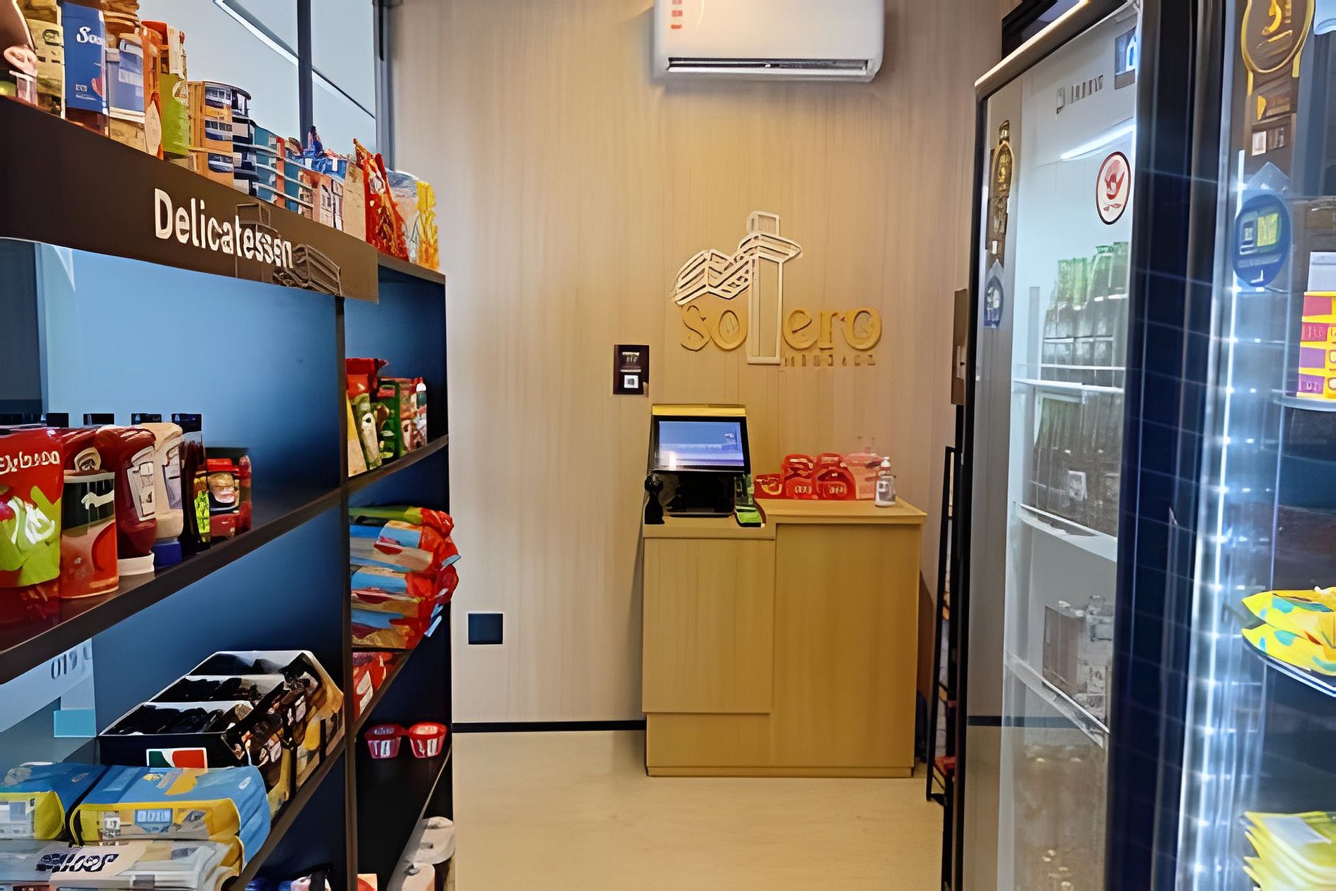No **térreo**, os hóspedes encontram **portaria, espaço fitness, lounge, terraço, playground e uma cafeteria**, que serve café da manhã, almoço, jantar e drinks. Também há uma **loja de conveniência (grab and go)** para pequenas compras do dia a dia.