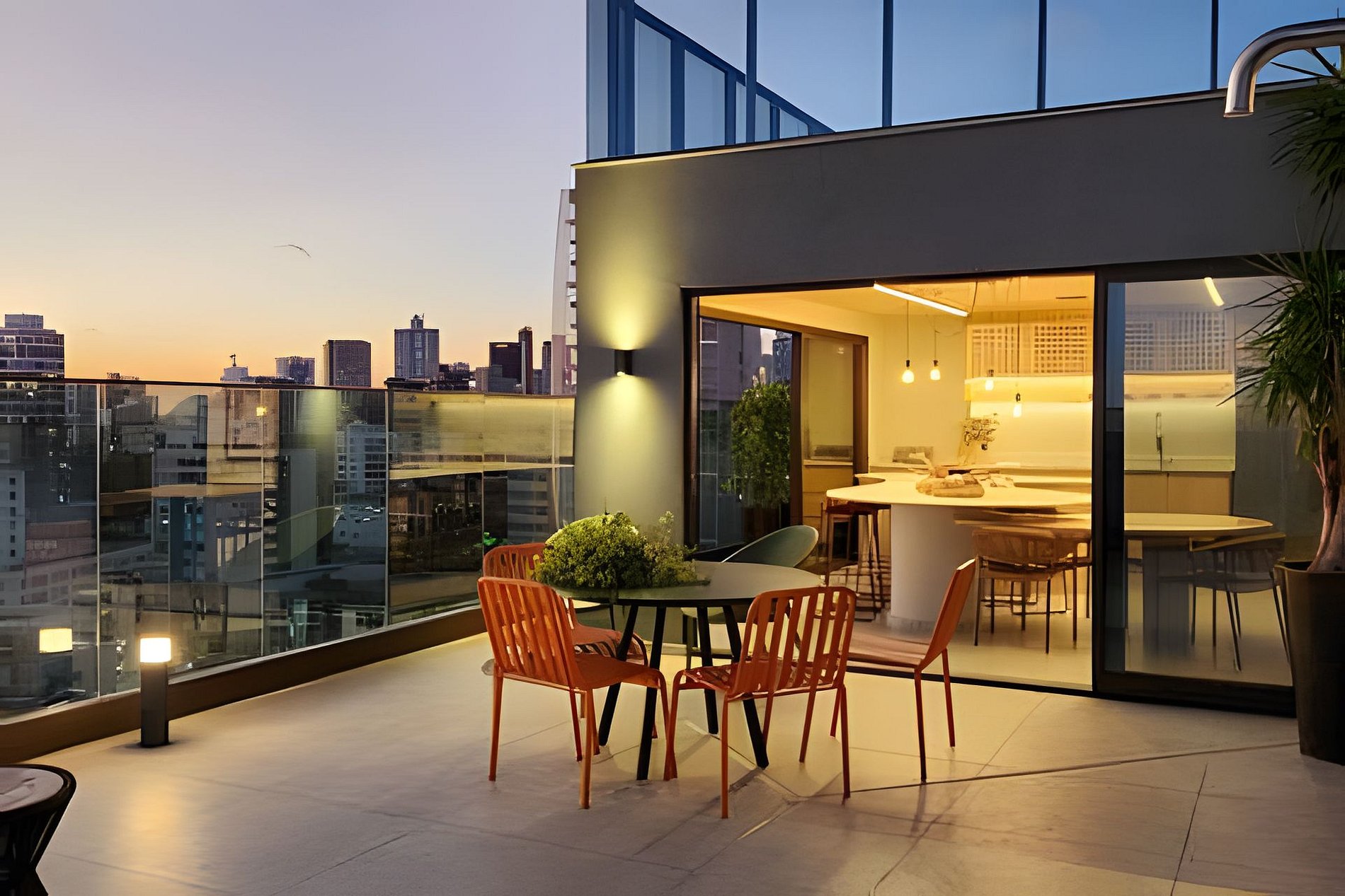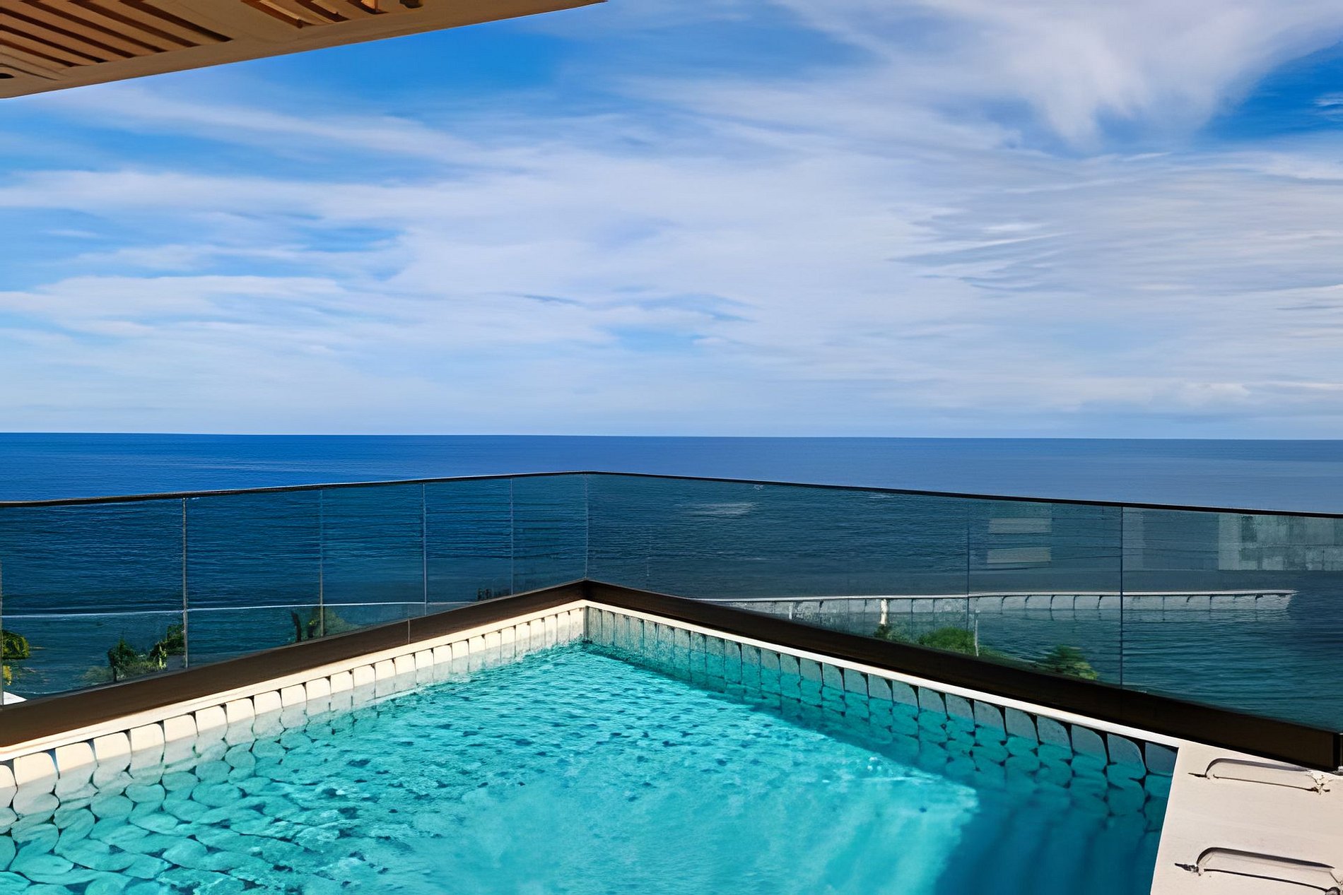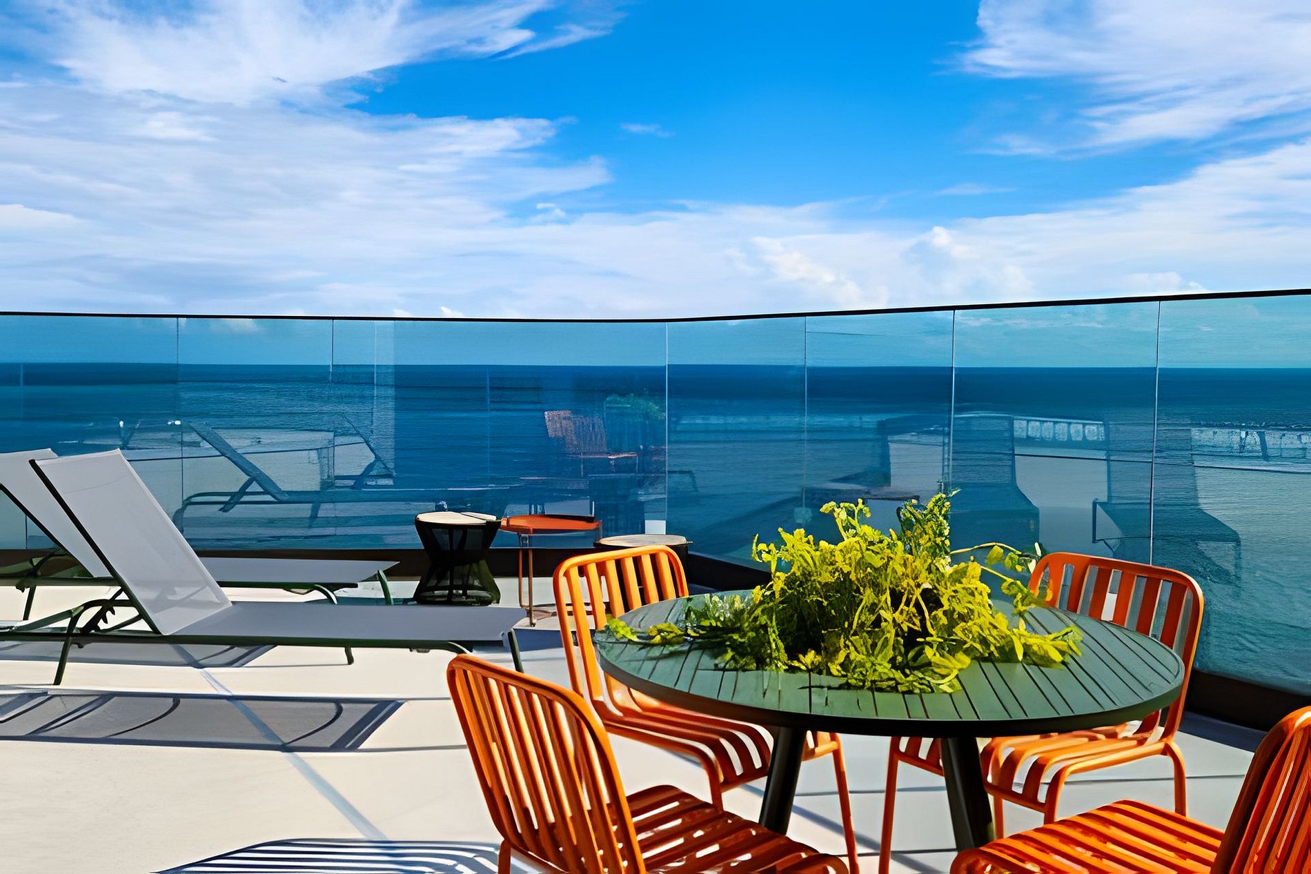 No **rooftop**, os hóspedes podem aproveitar um espaço especial com **área gourmet, coworking, deck e piscina com hidromassagem**, além de **uma vista incrível para o mar**, um dos grandes diferenciais do edifício.